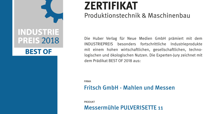 For the thirteenth time, the Huber publishing house for Neue Medien GmbH (New Media) selects outstanding companies from the industry for the INDUSTRIEPREIS (industry award) during the HANNOVER MESSE. According to the motto „Integrated Industry“ belongs the multifunctional, industry grade Knife Mill from FRITSCH in the category ”Research and Development” and is one of the best solutions for 2018. Therefore it belongs to the winners of the award for the most innovative products and solutions.