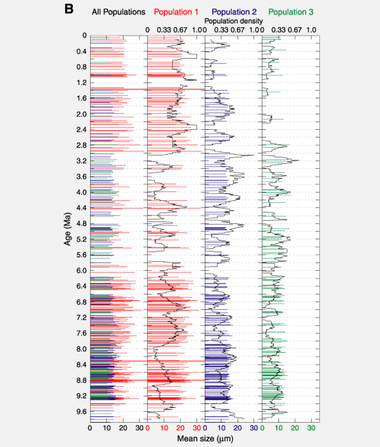 Fig. 5: Distribution of the single population applied over the drilling depth respectively the age of the sediments. Each population is colour coded and the amplitudes show the medium grain size. The black curves present respectively the share of the respective population in 10 m intervals.
