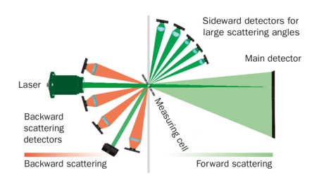 Для измерения частиц размером менее 100 нм требуется регистрация рассеяния света в обратном направлении (угол рассеяния более 90°). С этой целью в ANALYSETTE 22 NeXT Nano детекторы были специально установлены рядом с измерительной ячейкой. Источником света служит лазер с зеленым лучом, использующийся для создания одновременно и прямого, и обратного рассеяния. При разработке конструкции детекто- ров обратного рассеяния особое внимание было уделено подавлению нежелательных частей сигнала, возникающих, например, из-за отраже- ний на стеклах измерительной ячейки.