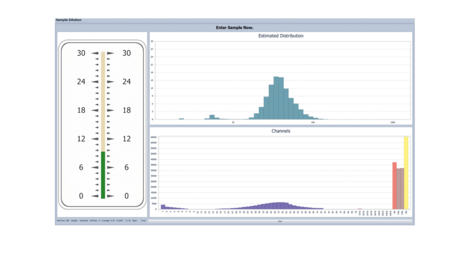 Затем управляющая программа предлагает оператору ввести измеряемый материал в ванну блока диспергирования. В процессе внесения материала оператор получает информацию о величине ослабления луча лазера за счет рассеяния на частицах измеряемого материала, и величина такого ослабления показывает оператору, когда следует завершить это внесение. После внесения материала, автоматически запускается процесс измерения, завершающийся проведением расчета распределения размеров частиц и выдачей количественного результата. В зависимости от заданного оператором числа таких процессов измерения проходит некоторое время до их окончательного завершения.