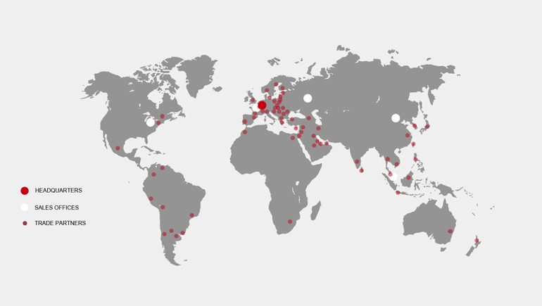С централью в Идар-Оберштайне, четырьмя торговыми представительствами в США, России, Сингапуре и Китае, 2 сотрудниками во Франции, 72 торговыми партнерами во всех важнейших экономических регионах мира, мы представлены во всем мире. Мы все равно стремимся еще больше расширить нашу сеть сбыта и сервиса с новыми торговыми представительствами и партнерами по техническому консультированию по применению и техническому обслуживанию на месте, лично и просто.