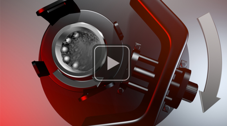 Измельчаемая проба в основном измельчается высокоэнергичным ударом размольных шаров. Для этого размольные стаканы с измельчаемым материалом и шарами вращаются на вращающемся планетарном диске в противоположную сторону вокруг своей оси. Начиная с определенной скорости, центробежная сила приводит к отделению измельчаемого материала и шаров от внутренней стенки размольного стакана. Размольные шары пересекают стакан по диагонали с максимальной скоростью и измельчают материал как дроблением о противоположную стенку стакана, так и сталкиванием шаров друг с другом. Благодаря скорости вращения планетарного диска - до 400 об/мин - PULVERISETTE 5 classic line развивает центробежное ускорение до 22 g.