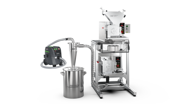 С очень сильной запатентованной FRITSCH режущей мельницы комбинация универсальной режущей мельницы PULVERISETTE 19 large с переменной частотой вращения ротора 50 - 700 об/мин, регулируемый , регулируемый и PULVERISETTE 19 с переменной частотой вращения ротора 300 - 3000 об/мин, а также входящий в комбинацию высокопроизводительного циклонного сепаратора FRITSCH, позволяют измельчить, например, 2 литра материала пробы с размером частиц 30 мм за всего один проход.