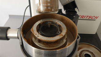 Afterwards we inspected the grinding chamber: No perforations were clogged, but it could be seen that the sample was very greasy and gradually adhered to the sieve pan holder and the collecting vessel. We packed the sample and cleaned the Variable Speed Rotor Mill PULVERISETTE 14 premium line equipment with a soft brush and hot water.