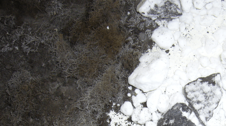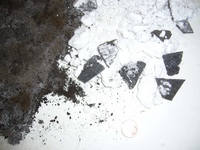 The second photo shows on the right side pre-crushed down to 3 cm pieces of material, which were mixed with dry ice and on the left side the ground material. Thereby the fibrous constituent parts were specifically separated and included in the photo.